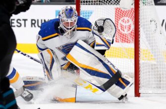 St. Louis Blues goaltender Joel Hofer (30) reaches